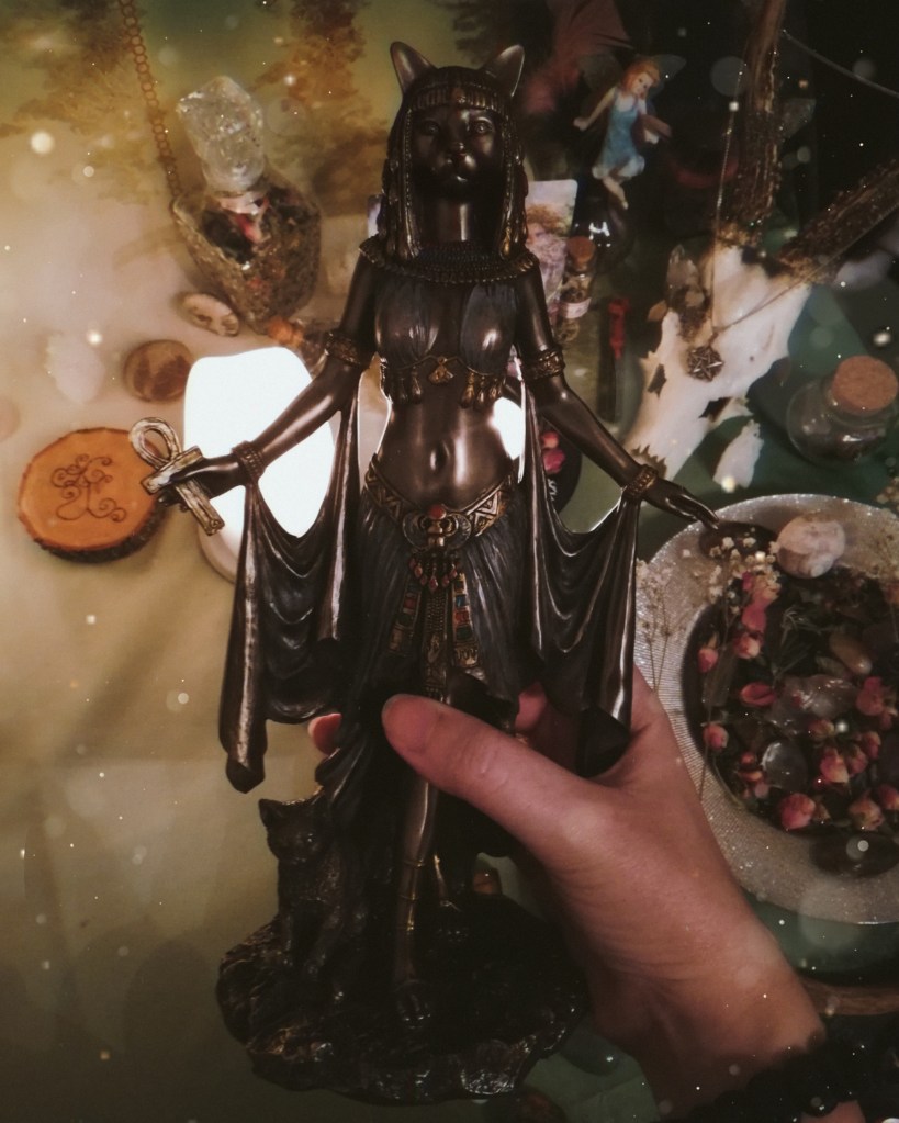 Vielleicht erscheint es dem ein oder anderen ungewöhnlich, dass bei mir – wo doch alles den Eindruck vermittelt, bei mir sei alles auf die Anderswelt und das Keltische ausgerichtet – eine ägyptische Gottheit auftaucht. Hierzu erst einmal vorweg, ja, mein „Schwerpunkt“ liegt sicherlich auf dem keltischen Paganismus, aber ich bin auch eklektisch – was bedeutet, dass ich vielen Feldern und Bereichen gegenüber geöffnet bin und dementsprechend vielfältig praktiziere… und im Fall von Bastet ist es so, dass sie mich tatsächlich schon im Alter von 12 bis ca. 19 Jahren begleitet hatte (später auch Anubis). Das ging einher mit einem unbändigen Interesse für das ägyptische Pantheon und generell das alte Ägypten mit seiner Kultur, Geschichte usw. Damals hielt ich es einfach nur für ein ausgeprägtes Interesse, ohne zu ahnen, dass viel mehr dahinter steckt. Und ja, wie sich anhand der Altersangabe vielleicht vermuten lässt, war diese Verbindung tatsächlich über 10 Jahre eingeschlafen. Die Rückführung am 29.12.2020 von der ich bereits hier berichtet hatte, hat das Tor in dieses Feld aber wieder geöffnet – und Bastet ließ in diesem Zusammenhang nicht lange auf sich warten…