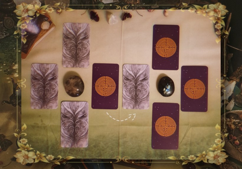 Danach werden die beiden mittleren Karten getauscht. Dieser Schritt symbolisiert den Übergang und die Verbindung der beiden Bereiche – und diese beiden Karten sind es, die dir am Ende einen Hinweis darauf geben sollten, was getan werden muss oder was nötig ist, alles in Einklang zu bringen.