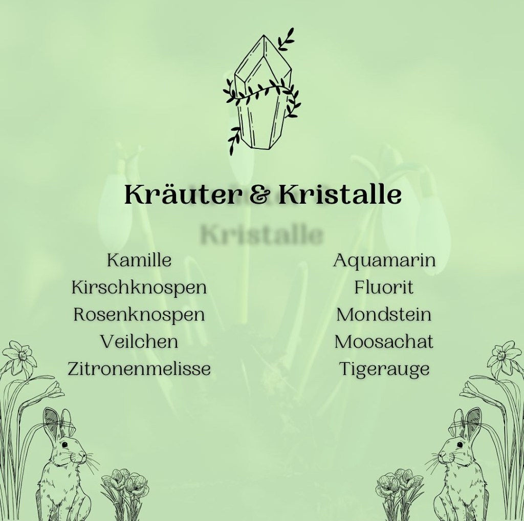 ⠀Daneben gibt es natürlich auch noch diverse Heilsteine und Pflanzen/Kräuter, die diesem Fest zugeordnet werden. Meine persönlichen Favoriten hierbei sind Amethyst, Fluorit, Mondstein und Moosachat sowie Veilchen, Krokusse, Kirsch- und Rosenknospen.